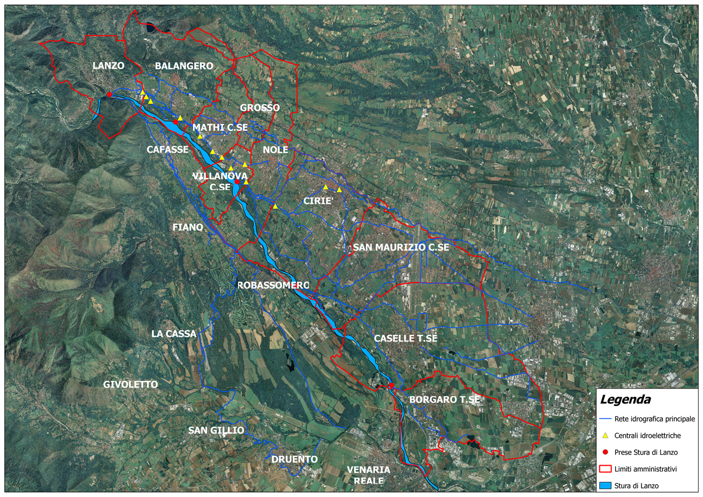 La rete idrografica principale ha origine presso la traversa di Lanzo con il canale Lanzo – Nole, dal quale si dirama una serie di canali secondari, fino al comune di Villanova C.se, dove è presente un partitore che dà origine ai canali di Villanova e Nole. Da qui la rete si infittisce e le portate transitanti vengono implementate nella stagione irrigua mediante la riattivazione delle prese ubicate in sponda sinistra lungo il percorso della Stura.